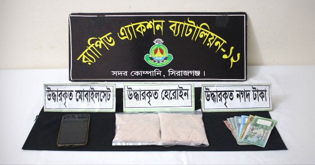 সিরাজগঞ্জের সলংগা থানার নলকা ওভারব্রিজ এলাকায় অভিযান চালিয়ে ৩১১ গ্রাম হেরোইনসহ এক মাদক ব্যবসায়ীকে গ্রেপ্তার করেছে র্যাব-১২। শুক্রবার (১৭ অক্টোবর ২০২৫) বিকেল ৪টা ৪৫ মিনিটে র্যাব-১২ এর সদর কোম্পানির একটি দল এ অভিযান পরিচালনা করে।